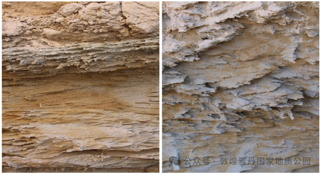 公园内的岩石形成于距今约6500万年的新生代,属于一套河湖砂泥质沉积物。岩层颜色多样,呈灰色、灰绿色和土黄色(图2)。古老的盆地中心部分层理水平分布,而边缘的层理则交错排列,并且局部还完好保存着许多虫迹化石(图3),这些化石生动地展现出古代河流和湖泊的特征。由于岩层产状水平,垂直节理发育,那些较松软的岩层在大自然疾风暴雨的长期风化作用下,逐渐形成了如今丰富多彩的雅丹风蚀地貌。