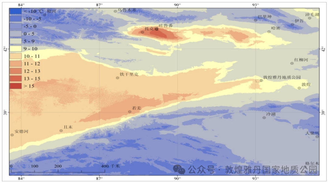 甘肃敦煌雅丹国家地质公园深居西北内陆,远离海洋,位于中蒙干旱区的中心区域,降水稀少且年际变化大,潜在蒸发量大,日照时间长,季节和昼夜温差大,干燥度在30以上,大风日数多,沙尘暴活动频繁,是典型的暖温带极端干旱气候。图4是雅丹周边地区多年平均降水量等值线图,从图中可以看出,敦煌雅丹国家地质公园地处欧亚大陆的极旱中心—托克逊(年均降水量为6.9mm)与其他三个极旱副中心—淖毛湖(年均降水量为19.1mm)、冷湖(年均降水量为16mm)和且末(年均降水量为24.8mm)所围成的四边形内,是欧亚大陆最干旱的区域,研究区降水量在40mm以下;从图5可以看出敦煌雅丹国家地质公园位于塔里木盆地干热中心的东缘,年均温>10℃。总之,敦煌雅丹国家地质公园是我国西北地区最干、最热和沙尘天气活动最为频繁的地区之一。